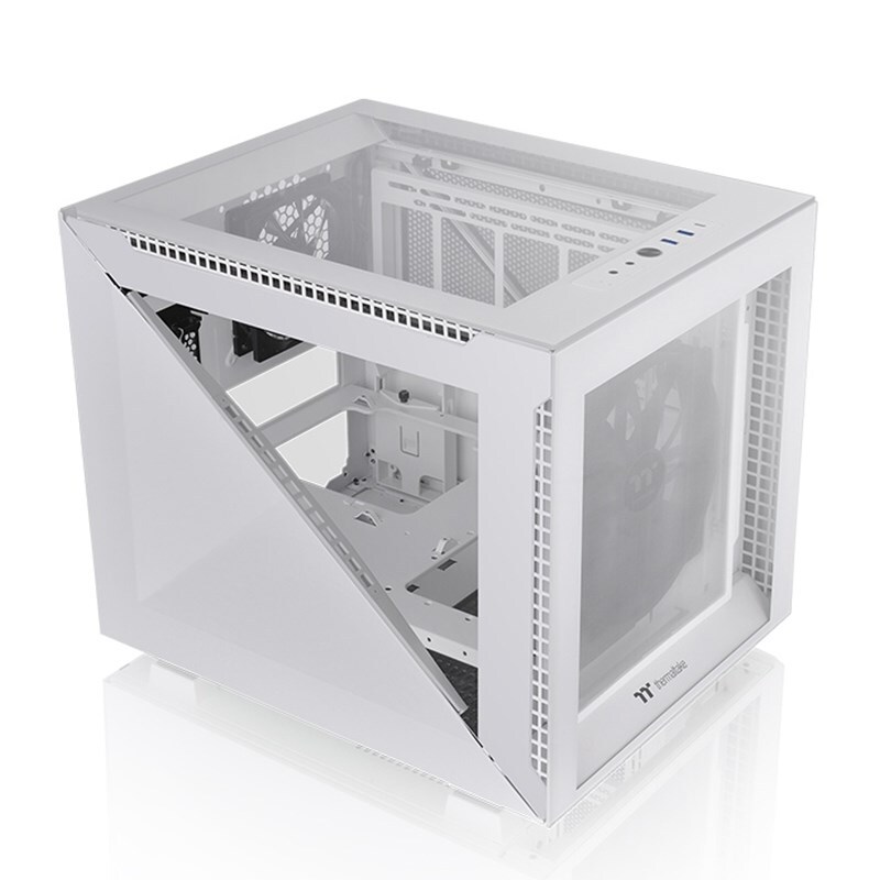 Thermaltake designed a brand-new case series that contains a mixture of open-frame-styled elements and customizable options blending all the functionalities into the Divider Series. The Divider 200 TG Snow is the first Micro-ATX edition to the Divider Series. Just like the other models, the most exceptional feature of the Divider 200 TG Snow is the two symmetrical triangular pieces comprised of a steel panel and a tempered glass window on the left side. These panels are tool-free and easy to remove, offering a clear view of the components inside.