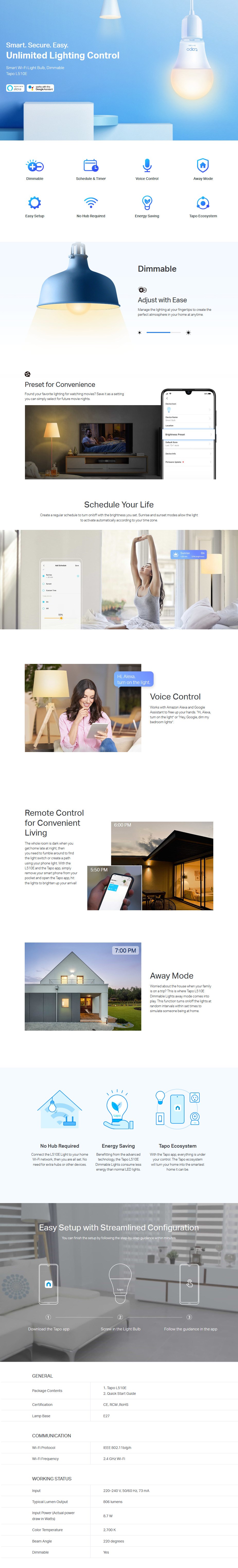 TP-Link L510E Tapo Smart Wi-Fi LED Bulb with Dimmable Light - Edison Fitting - Desktop Overview 1