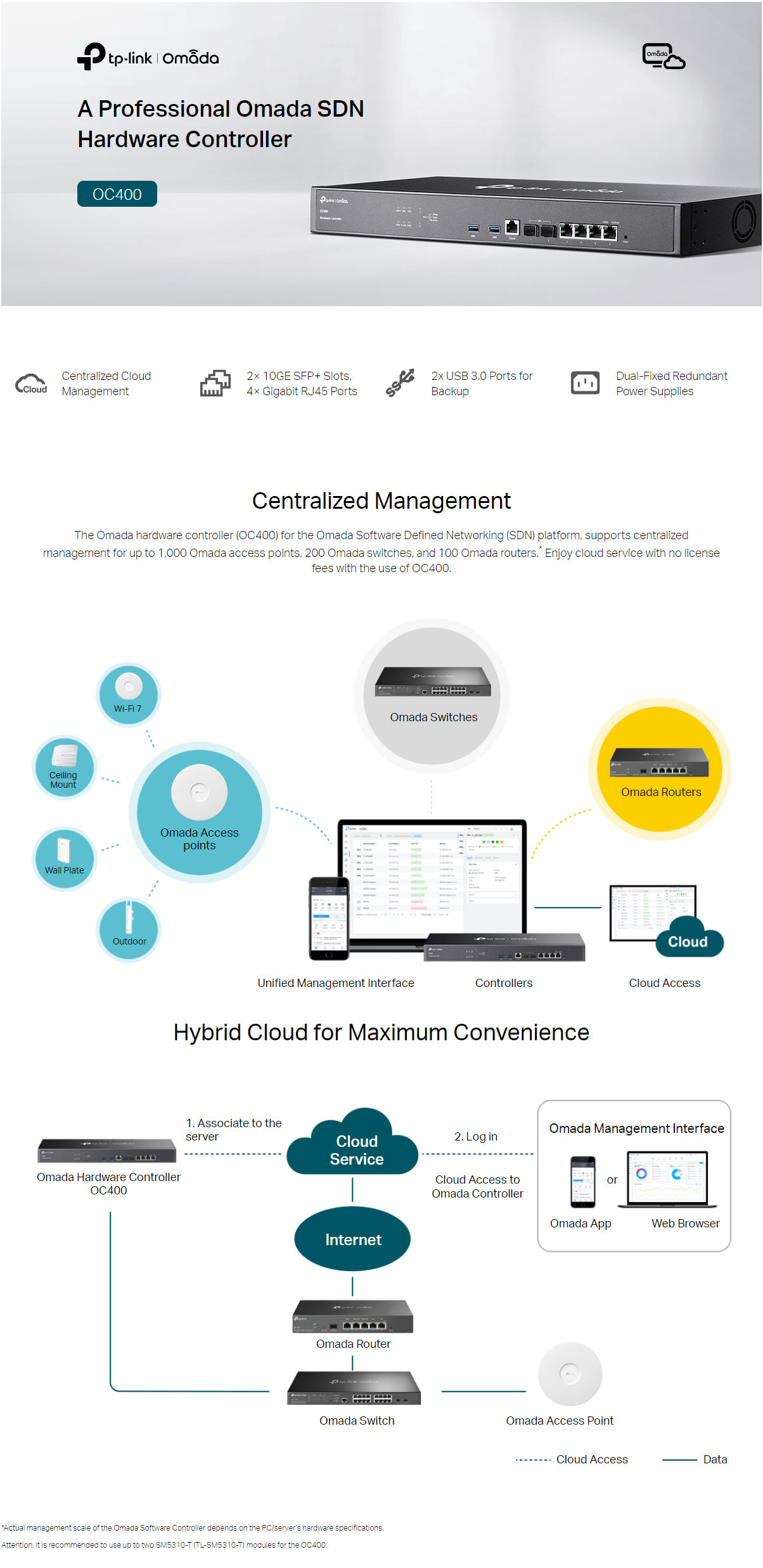 • Centralized Management: for up to 1,000 Omada access points, 200 Omada switches, and 100 Omada routers.*