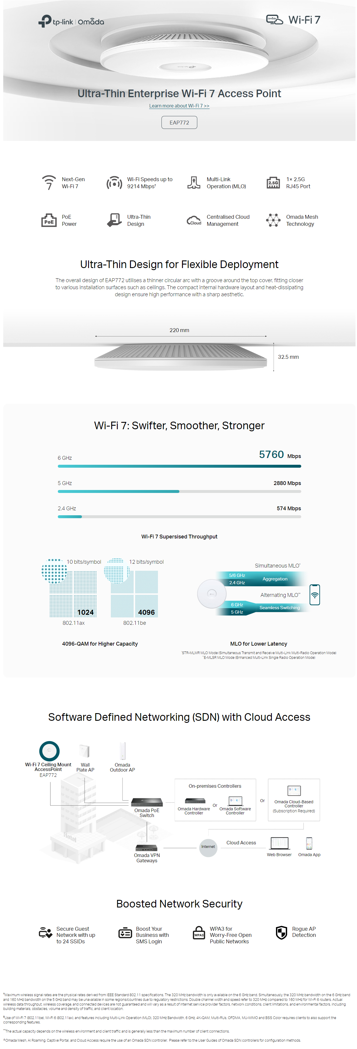 | Cloud Access | Yes. Require the use of an OC300, OC200, Omada Software Controller, or an Omada Cloud-Based Controller. |