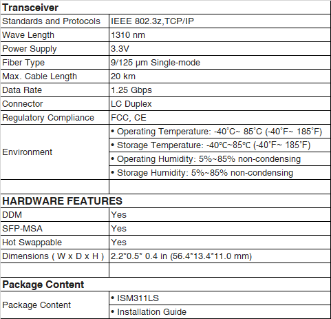 ISM311LS is an industrial SFP Module introduced for extending transfer distance. Attached to our industrial switches, ISM311LS can extend the distance to 20km. Users can choose whether and which items to use the fiber modules according to the demand in order to lower cost.