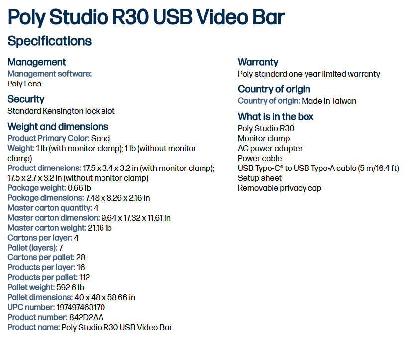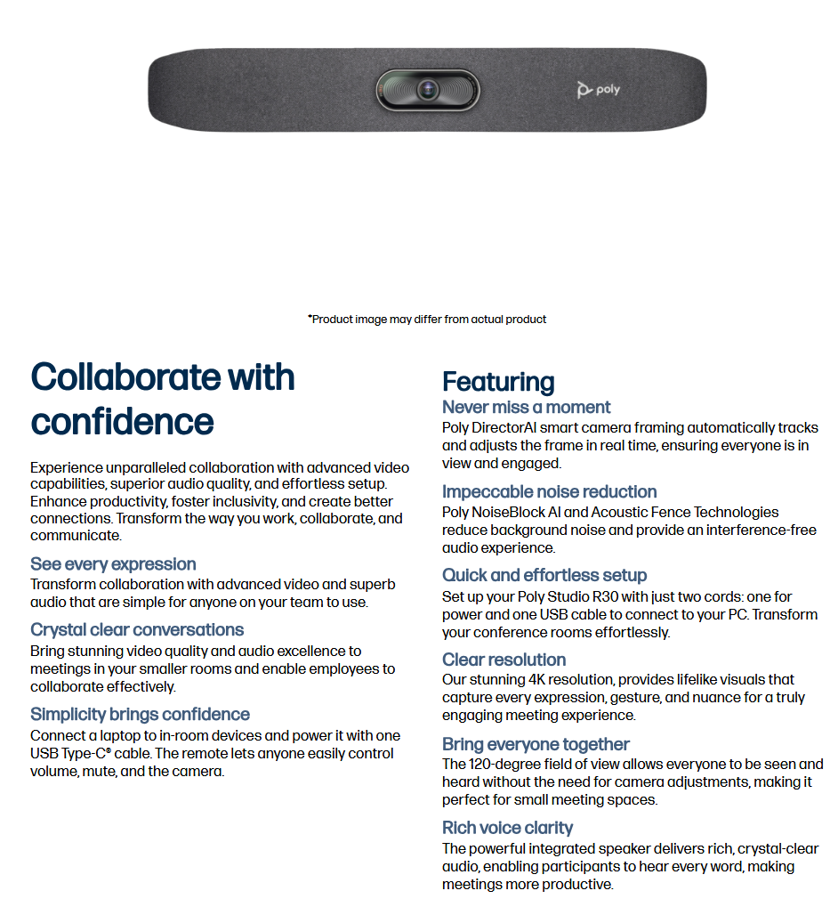 HP Poly Studio R30 4K All-in-One Video Conference Camera 2200-69390-012