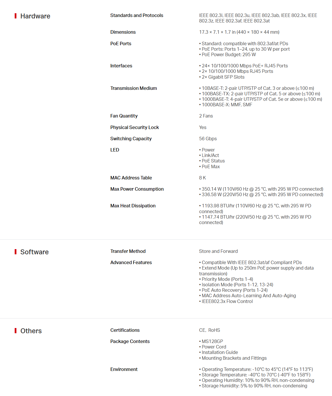 • High Power PoE+: Support PoE Power up to 30 W for each PoE port and 295 W for all PoE ports.* Working with IEEE 802.3af/at compliant PDs