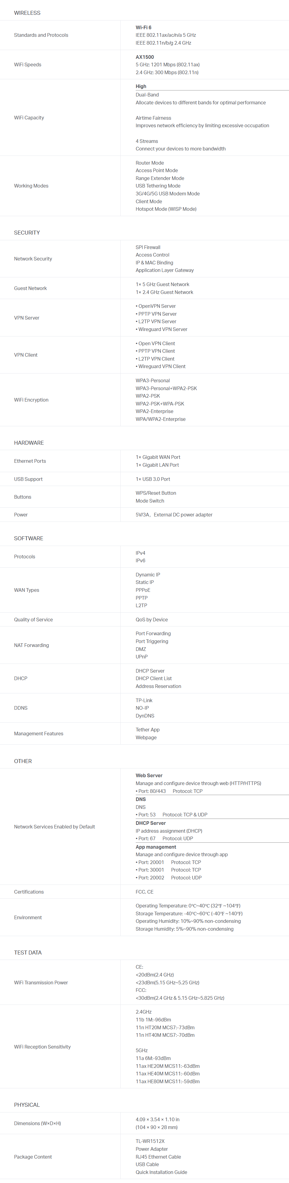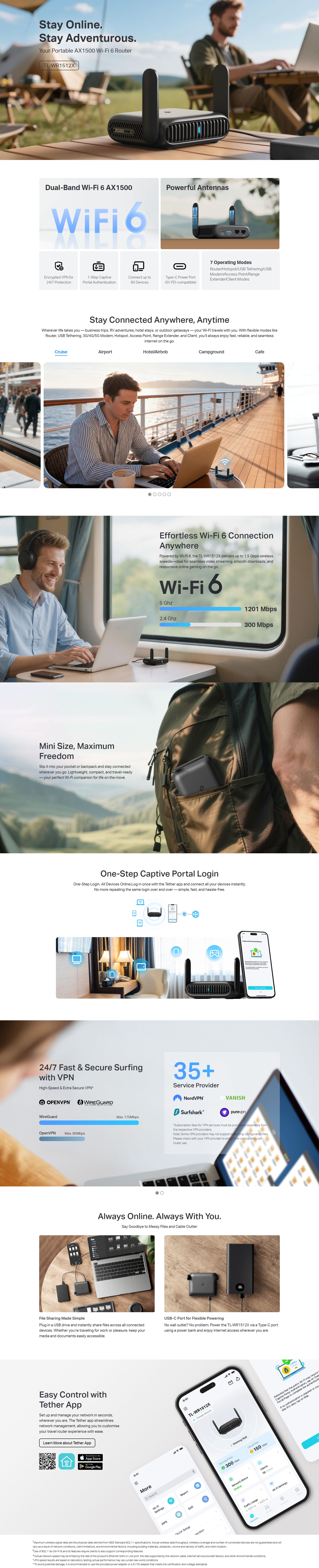 - Flexible Wi-Fi Anywhere, Anytime: With versatile modes including Router, USB Tethering, 3G/4G/5G USB Modem, Hotspot, Access Point, Range Extender, and Client, TL-WR1512X enables flexible Wi-Fi setup for homes, hotel stays, and travel.