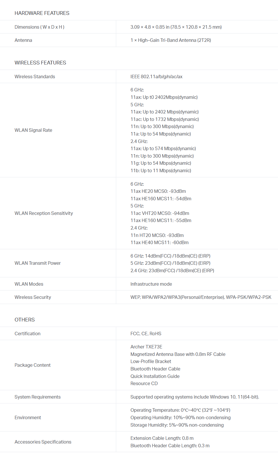 TP-Link Archer TXE73E AXE5400 Wi-Fi 6E Bluetooth PCIe Adapter
