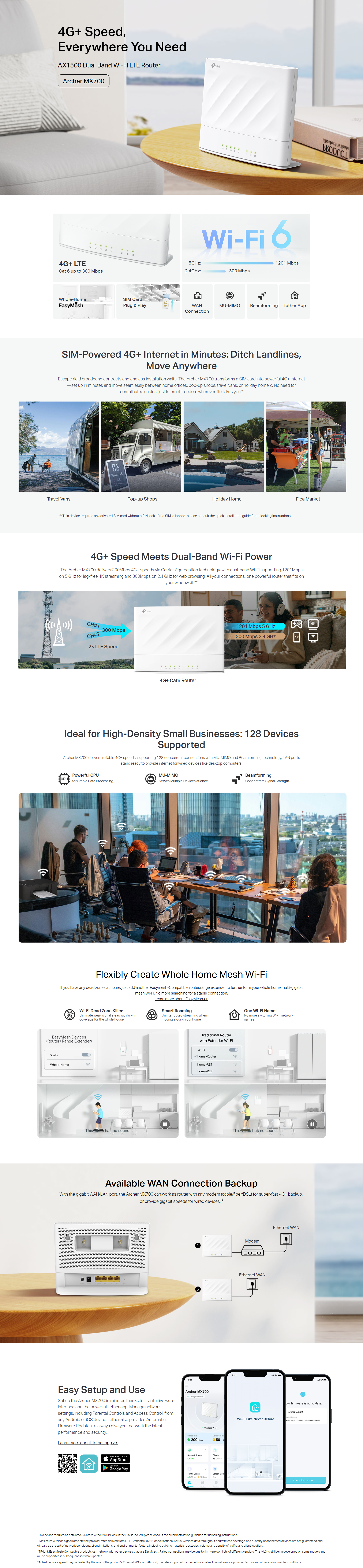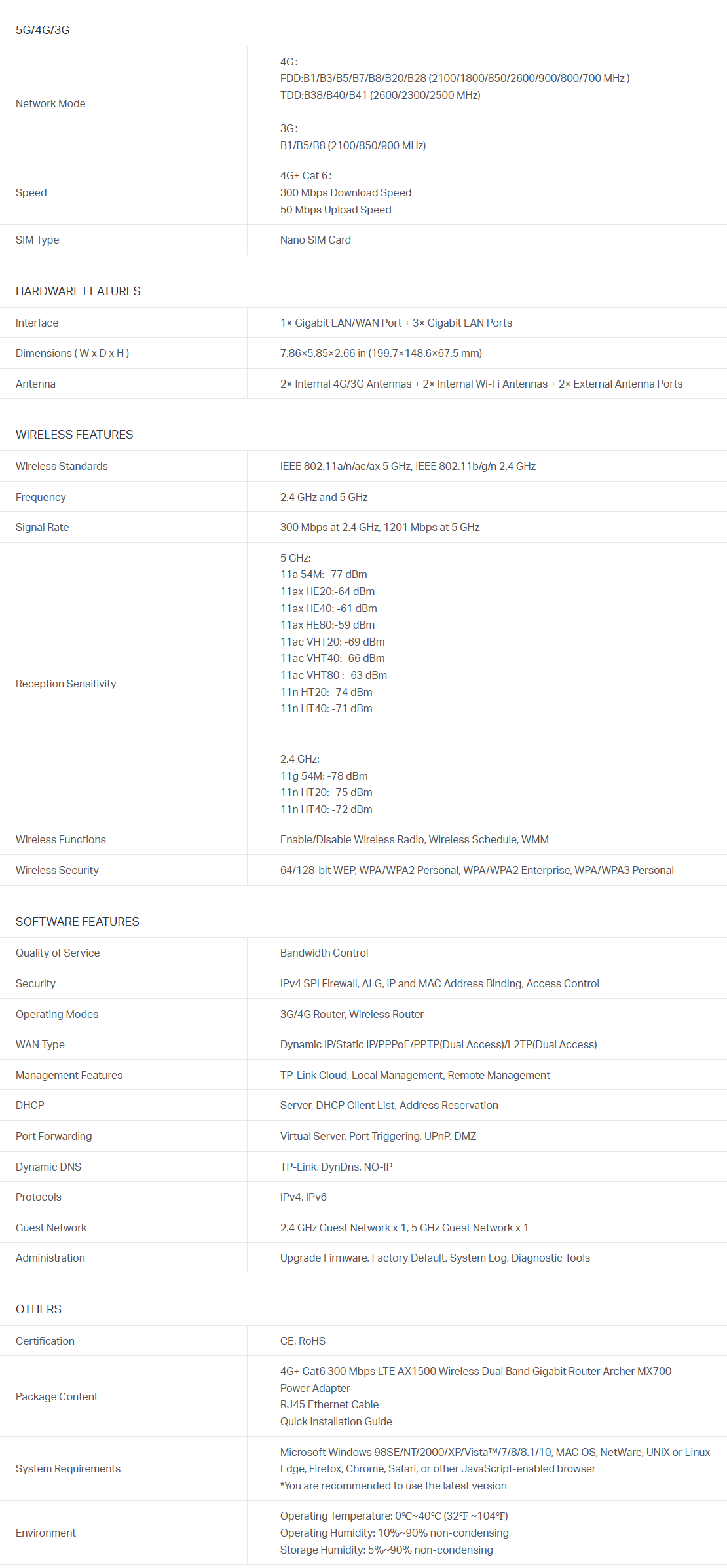 TP-Link Archer MX700 4G+ AX1500 Dual Band Wi-Fi LTE Router