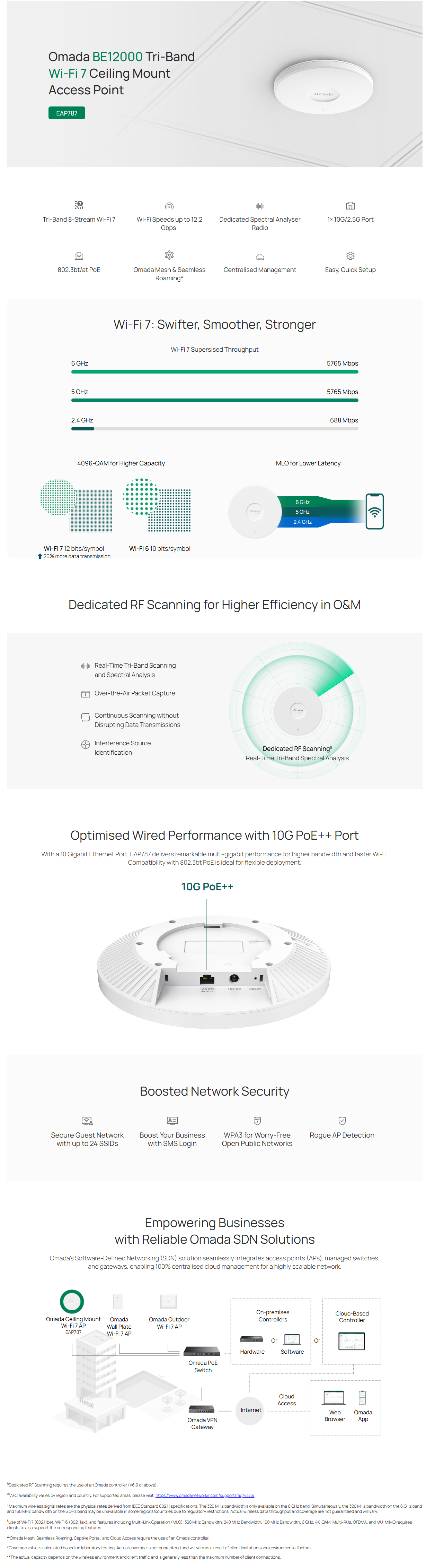 - Tri-Band 8-Stream Wi-Fi 7: 5765 Mbps on 6 GHz, 5765 Mbps on 5 GHz, and 688 Mbps on 2.4 GHz.†