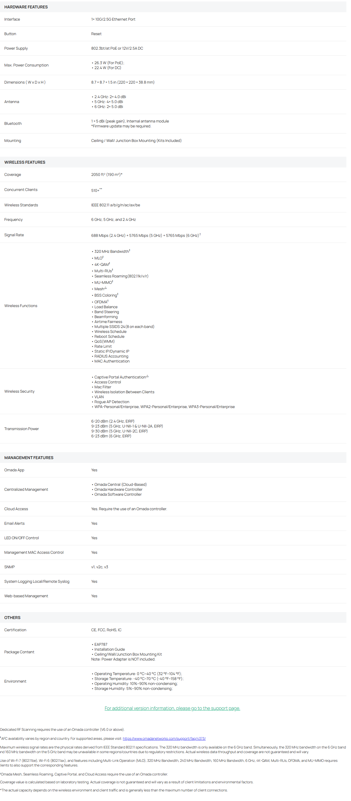 - Flexible Deployment and Easy Setup: Supports both 802.3bt PoE and DC power supply for flexible installation with Omada SDN for one-click setup.