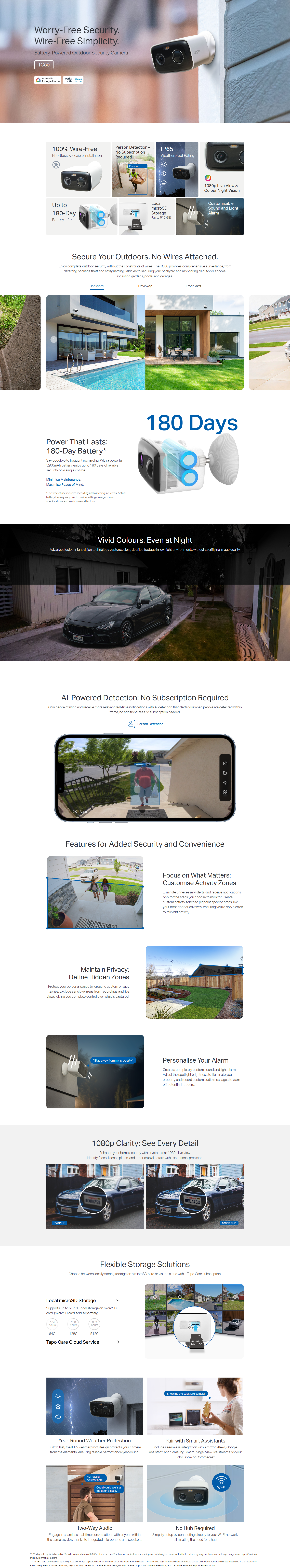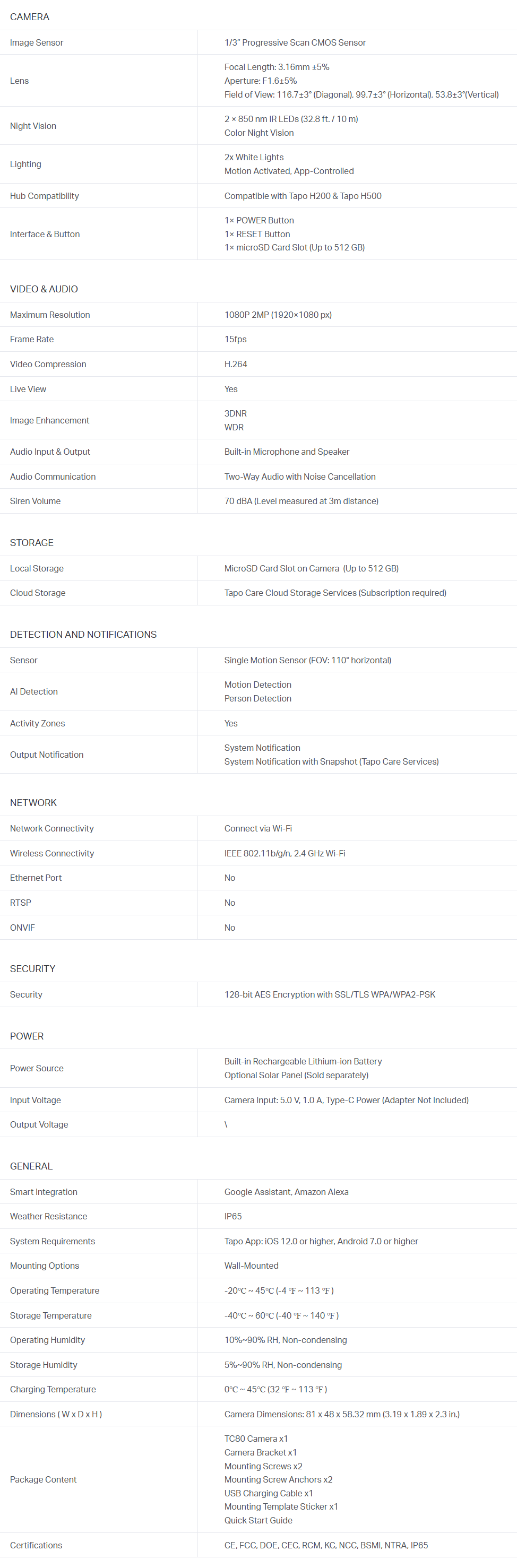 • Local & Cloud Storage: Record locally to a 512GB microSD card (not included) or subscribe to Tapo Care for 30-day cloud storage.**