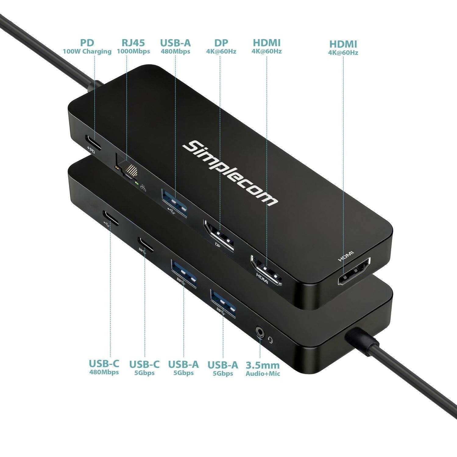 Simplecom CHT811 11-in-1 USB-C 4K Triple Display MST Docking Station with Dual HDMI DP