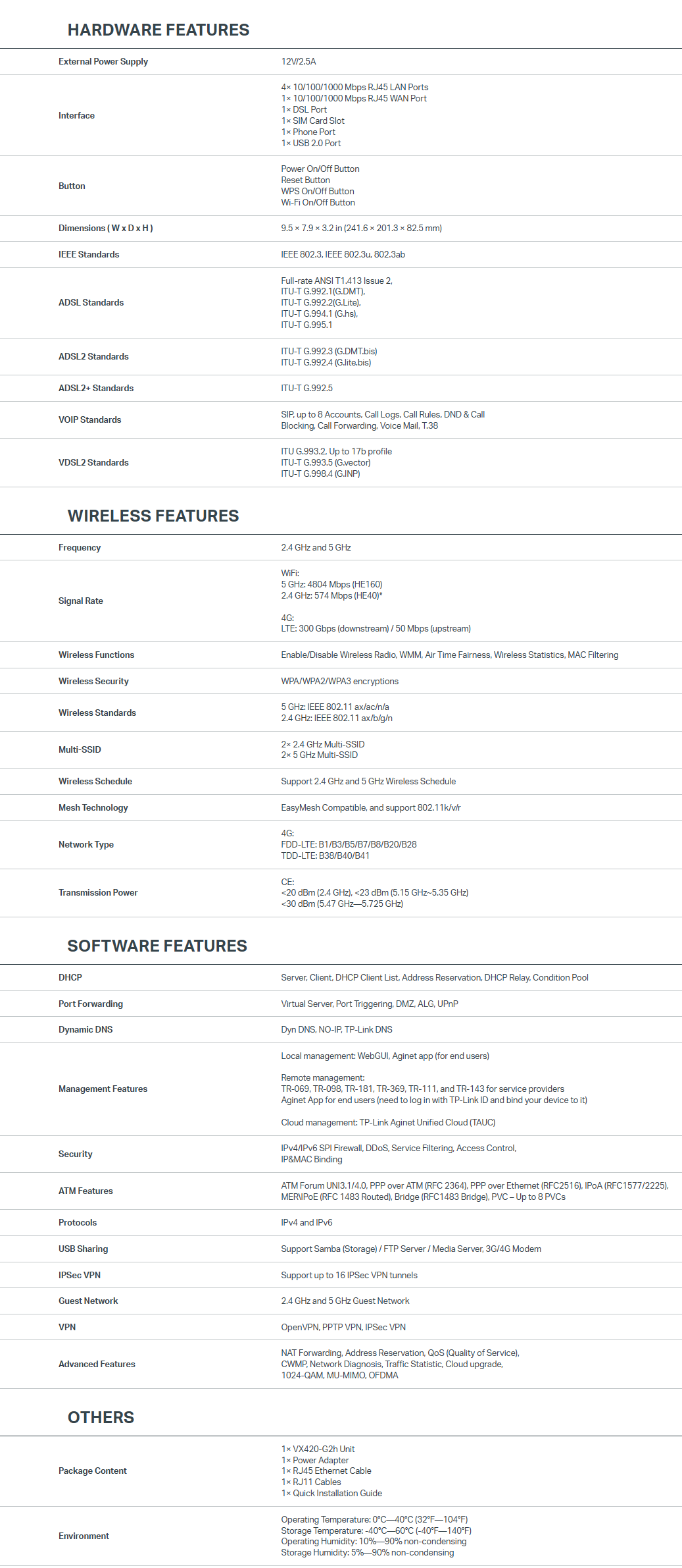 • Remote Management: Supports TAUC (TP-Link Aginet Unified Cloud), TR-069/TR-098, TR-181, TR-111, TR-104, and TR-143 protocols for centralised management via internet service providers.