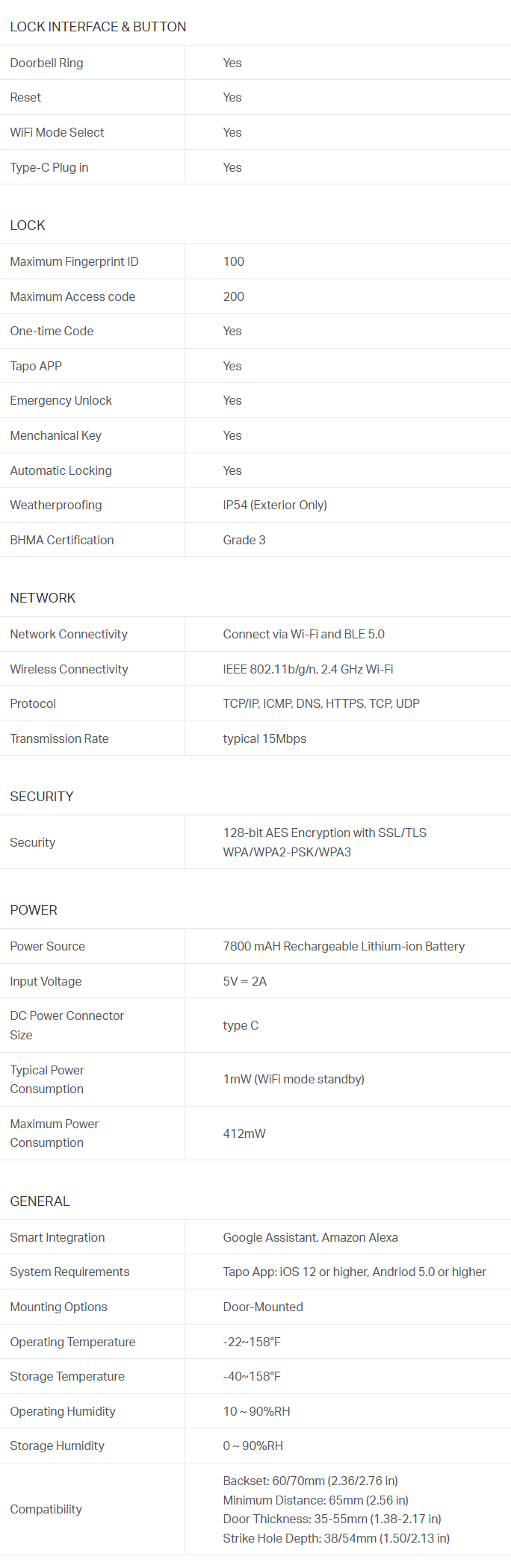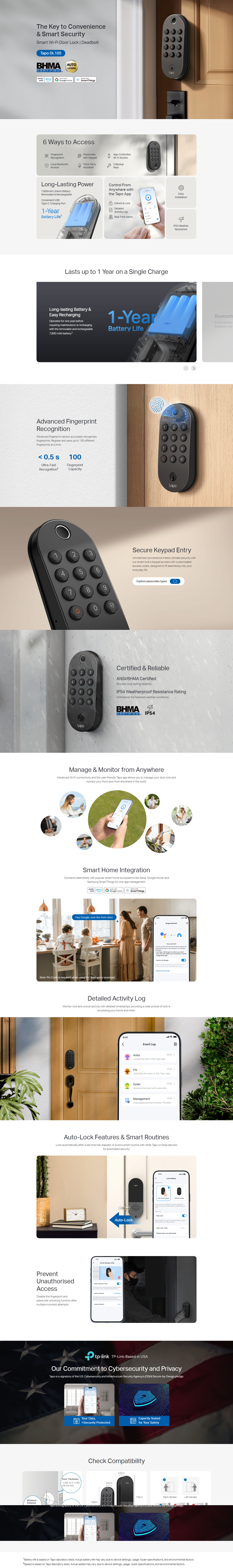 - 6 Ways to Securely Access: Unlock with the Tapo app, by fingerprint, Bluetooth, keypad, Smart Assistant, or with included backup keys.