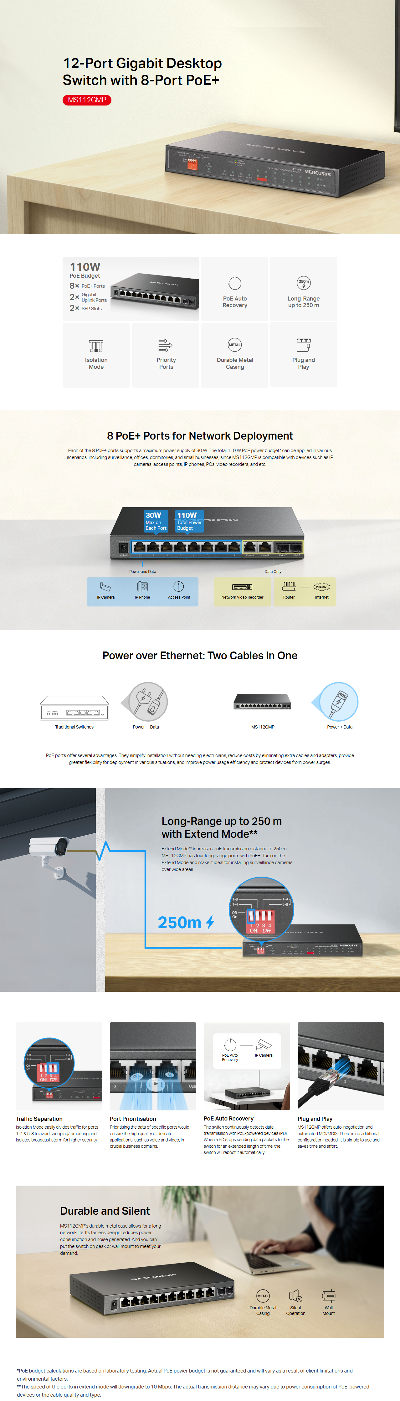 - 8× PoE+ ports transfer data and power via a single cable with a total power budget of 110 W*