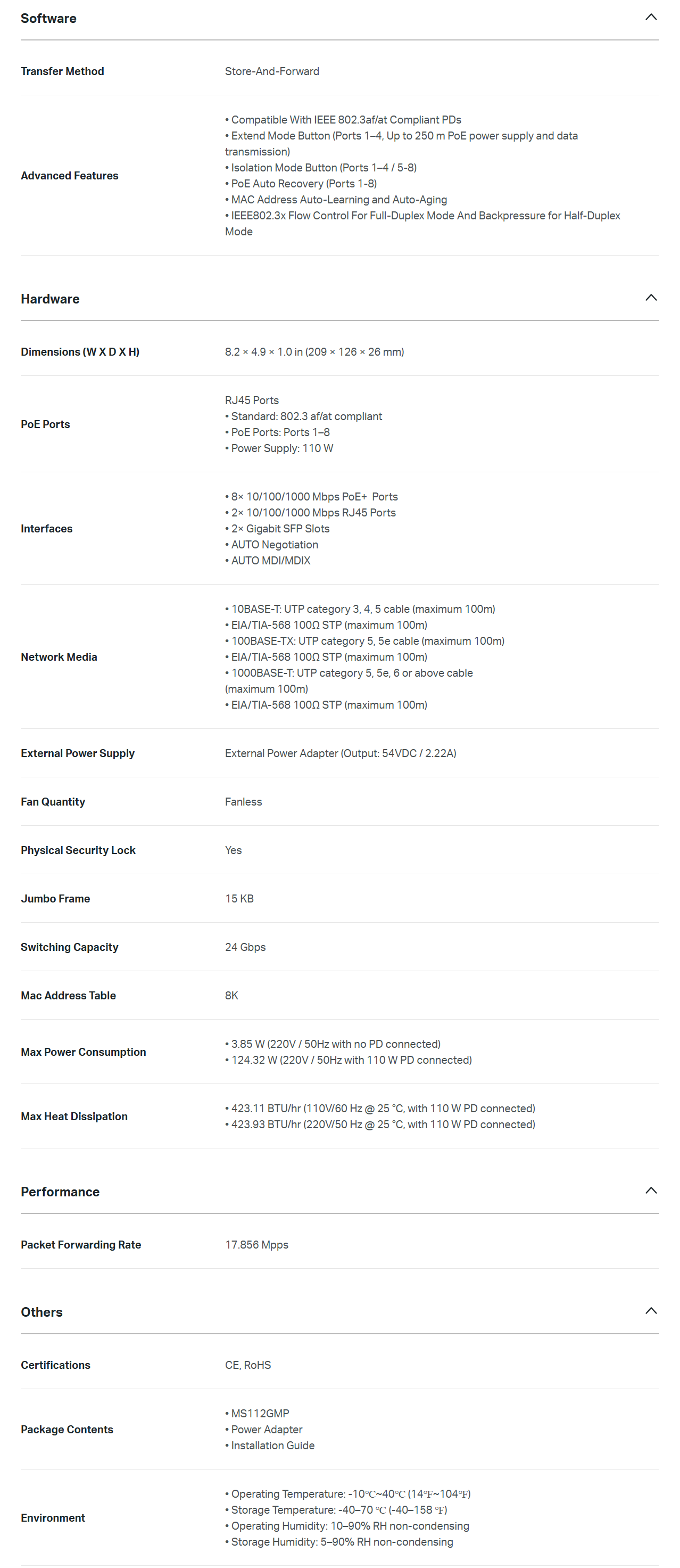 - Compliance with IEEE 802.3af/at PoE+, the switch supports PoE Power up to 30 W for each PoE port